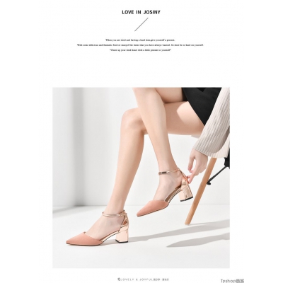 卓诗尼高跟鞋女2018春季新款浅口粗跟中空单鞋优雅一字扣尖头女鞋 品牌正品 假一罚十